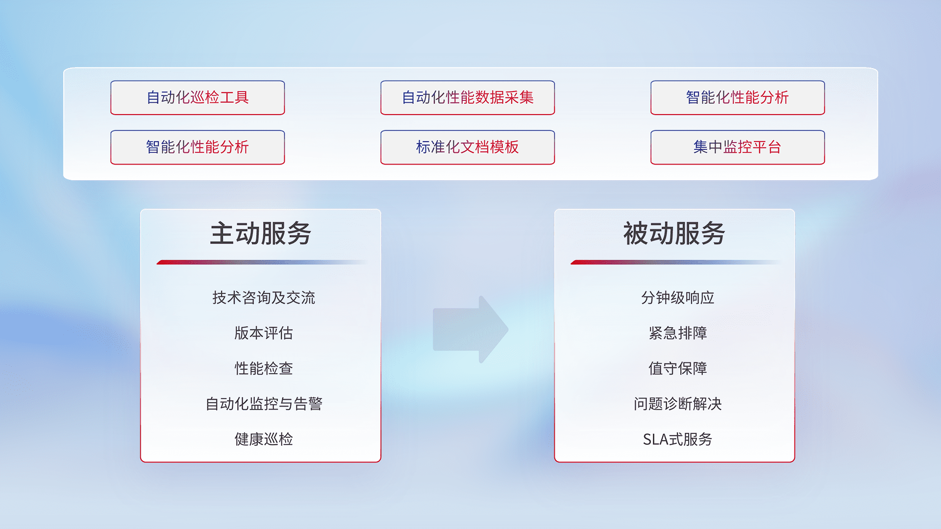 智能化工具和标准化文档,,,保障服务质量,,,提供主动服务(包含技术咨询、、、、版本评估、、、、性能检查、、、、自动化监控与告警、、、健康巡检)和被动服务包含(分钟级响应、、、、紧急排障、、、值守保障、、、问题诊断解决、、SLA服务)。。
